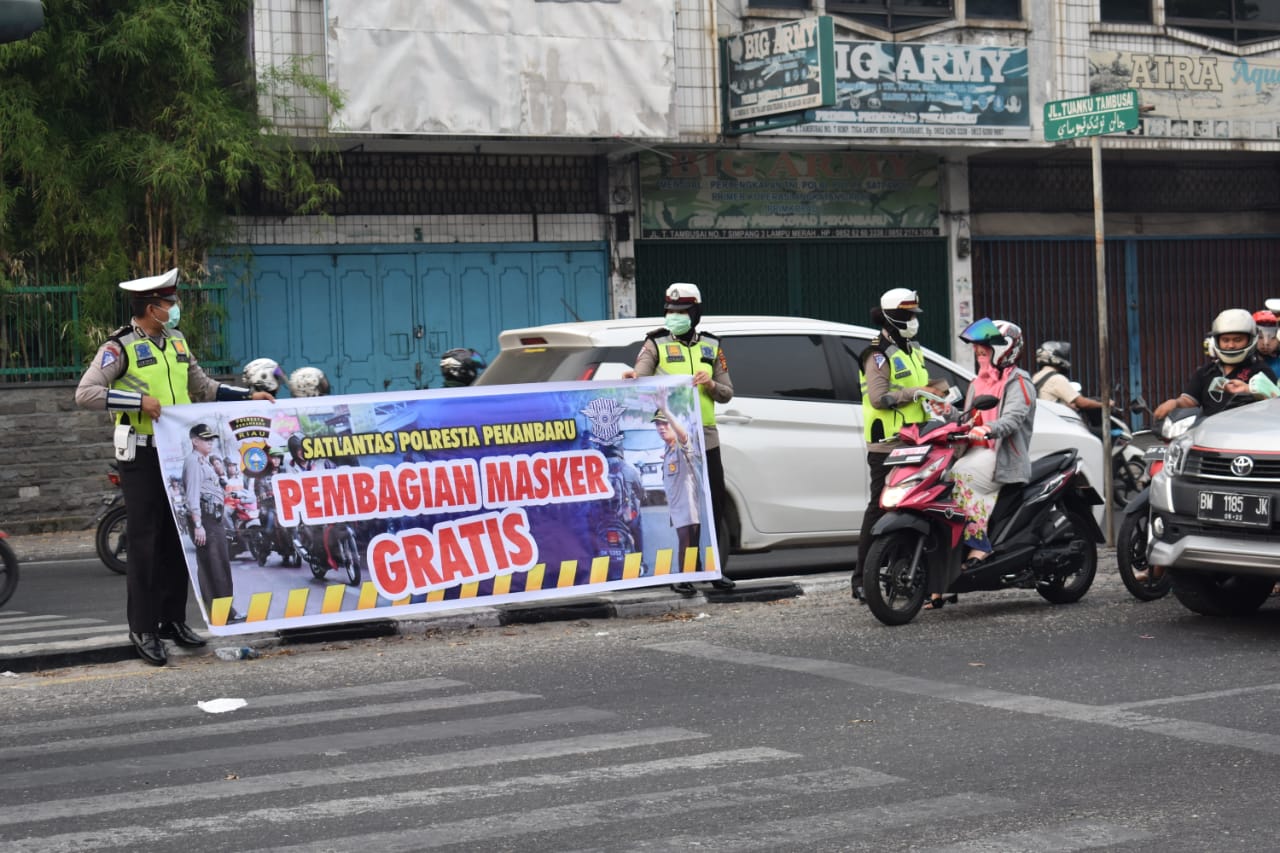 Kegiatan pembagian masker gratis saat itu, Satlantas Polresta Pekanbaru juga bergabung dengan Ditlantas Polda Riau.