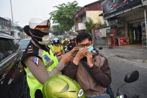 PEKANBARU, SIAGANEWS.CO – Satuan Lalu Lintas Polresta Pekanbaru bagi bagi masker gratis kepada pengendara, Jumat (9/8/2019).