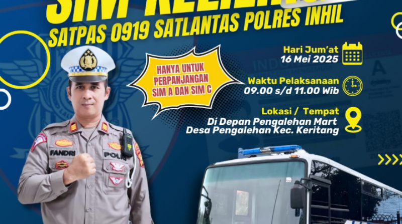 Kali ini, layanan SIM Keliling akan hadir di Depan Pengalihan Mart, Desa Pengalihan, Kecamatan Keritang, pada Jumat, 16 Mei 2025, mulai pukul 09.00 hingga 11.00 WIB.