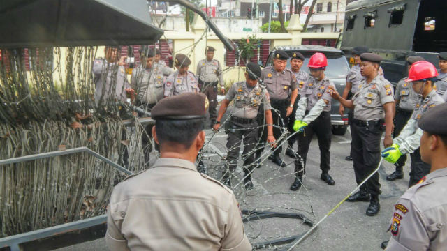 PEKANBARU,SIAGANEWS.CO- Personil Shabara Polresta Pekanbaru menggelar latihan cara penggunaan alat Security Barrier (gulungan kawat berduri). Kegiatan ini dilakukan di halaman Polresta Pekanbaru Jalan A Yani, Senapelan, Pekanbaru, Kamis (10/3/16) pagi.