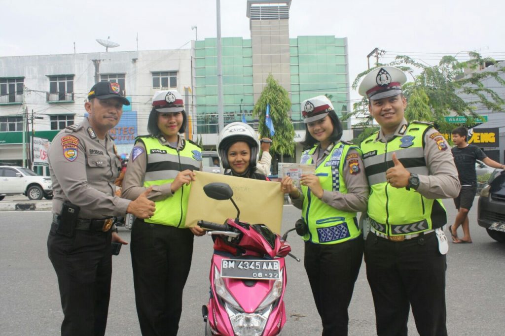 “selamat ya mbak, karena mbak sudah tertib berlalu lintas, kami dari Polresta Pekanbaru memberikan hadiah, tolong diterima mbak”, ujar sang Polwan Bripda Gita, sambil menyerahkan bingkisan.